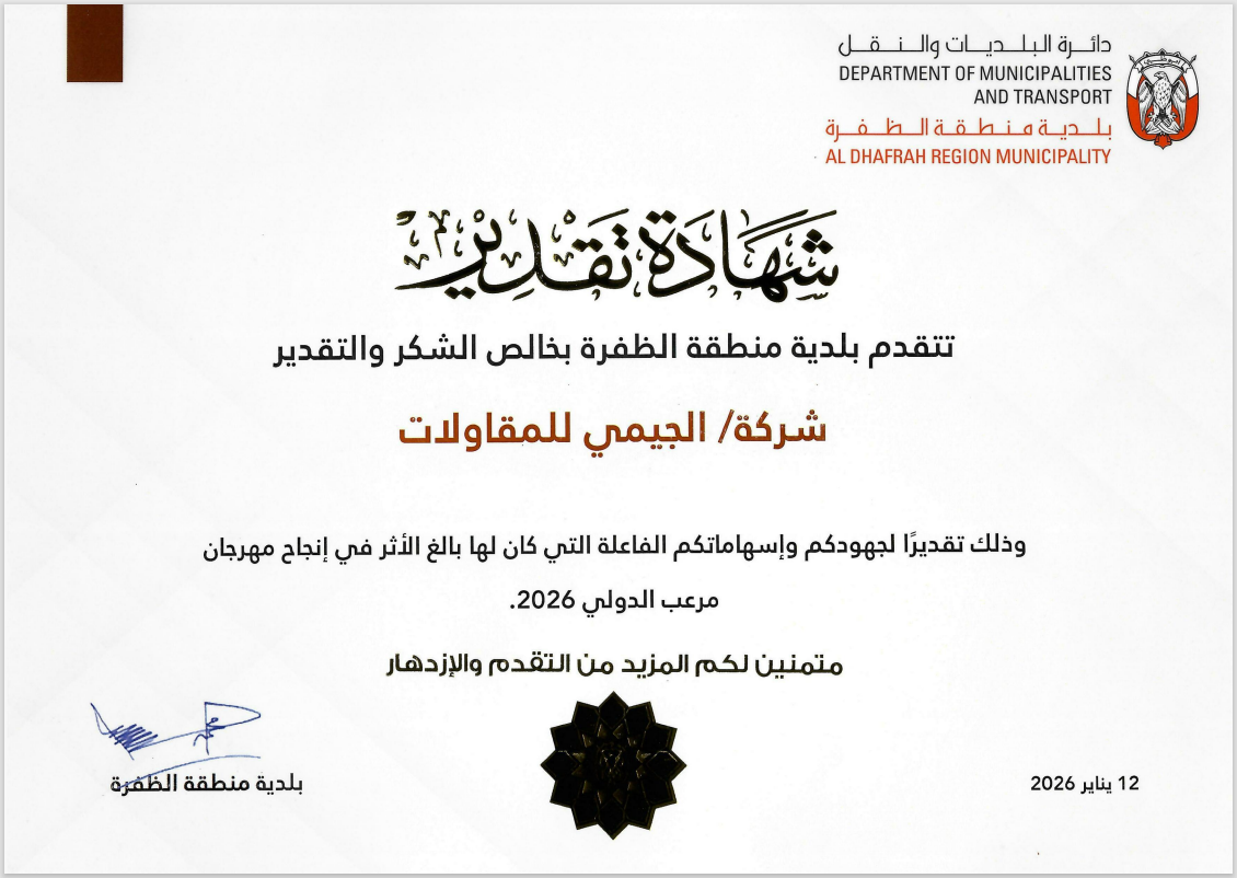 Al Geemi is proud to announce that our Liwa Project team has received an Appreciation Certificate from Al Dhafra Region Municipality (DRM), recognizing their exceptional support during the Liwa International Festival 2026.